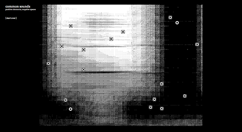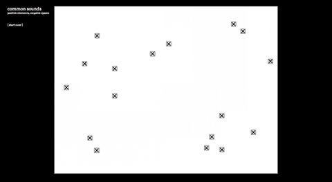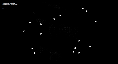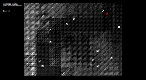In design and writing, negative space shapes positive object. One does not exist without the other. Common Sounds explores this symbiotic duality with interaction and remixing, presenting an environment that invites the user to both perform an audio-visual composition as well as write a non-linear narrative. Thus, the listener also becomes a performer and the reader becomes a writer.