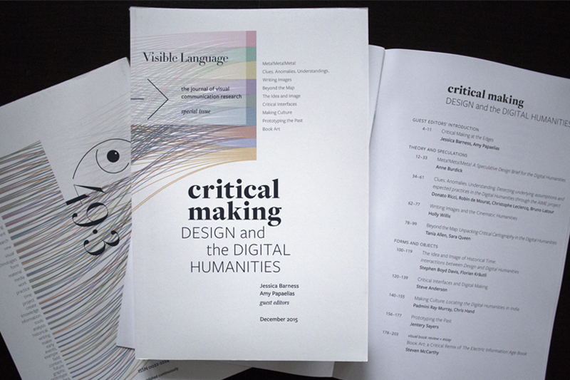 This special issue of Visible Language journal locates where, how and why critical making is emerging in the disciplines of design and the digital humanities, and the ways it might exist in published form. The project contains an interdisciplinary collection of articles, peer-reviewed by an interdisciplinary group of international scholars.