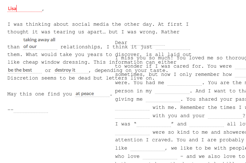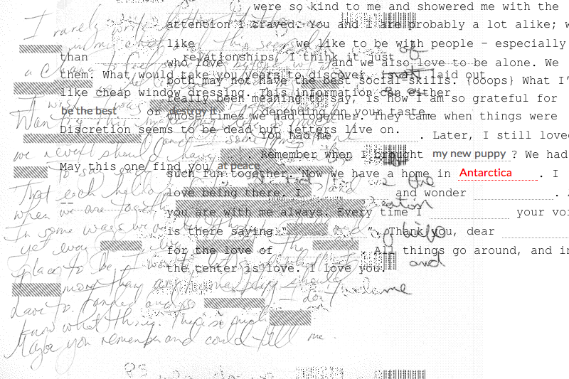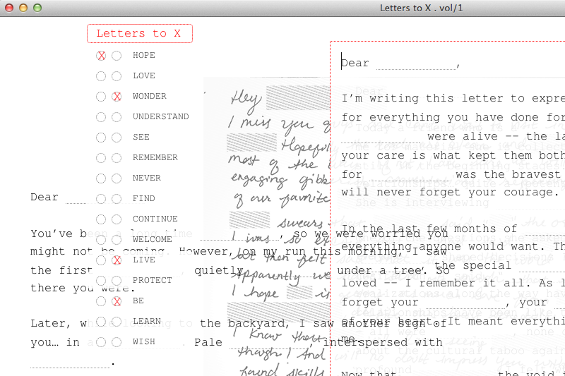 Social media and digital interaction have changed the ways we connect with one another. We are writing more now than we ever have, yet screen correspondence as an everyday social activity may not effectively relay deeper emotions that were once historically expressed on paper. Letters to X . vol/1 is my response and a critique, as well as an ongoing inquiry into correspondence, writing and interaction design. I invited writers, poets, designers and artists to collaborate and write a letter to X (which might be me, another person, the universe, etc) that contains content that is, in some way, personal and emotionally driven — the sort of content one might not typically email, text message or post to a social media website. The interface contains both the original handwritten letters (censored) as well as the typed phrasal template version (opened). The authors of these letters remain anonymous. Letters made through the site can be saved or printed using the browser.