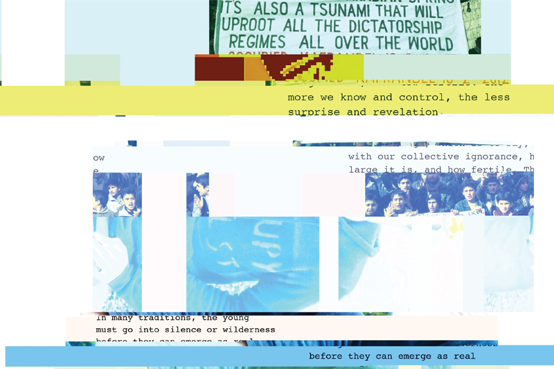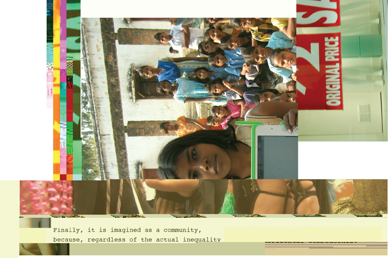 Photographs, sourced by keywords related to class, faith, gender, politics and sexuality, are fused together at the level of code bits to graphically expose the influence of one piece of social identity on another. Each assemblage is accompanied by documentation of its text-image parts, and the viewer is invited to read through the compositions in multiple ways. All photographs used under a Creative Commons CC BY 2.0 license.